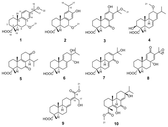 Three known compounds were identified as (4R,5R,10S)-12-hydroxy-15-methoxy-7-oxo-abieta-8,11,13-trien-18-oic acid (3) [23], totara-8-en-7,13-dioxo-18-oic acid (5) [23], and macrophypene I (6) [24] by comparison with the literature data.
