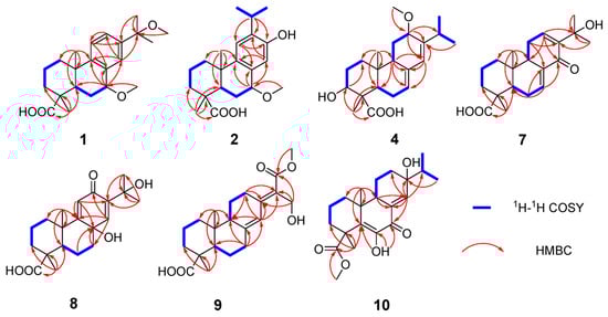 Key 1H-1H COSY and HMBC correlations for 1, 2, 4, and 7–10.