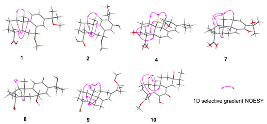 Key 1D selective gradient NOESY correlations for 1, 2, 4, and 7–10.