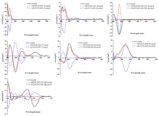 The absolute configurations of 1, 2, 4, and 7–10 were determined by comparing the corresponding theoretical ECD spectra with the experimental spectra using the SpecDis (v1.62) program. For performing Molecular Mechanics Free Field (MMFF) and DFT/TDDFT calculations, the Spartan (v’14) software package (Wolfram Inc., Irvine, CA, USA) and the Gaussian (v09) software package were utilized [27,28,29] (References [28,29] are cited in Supplementary Information). MMFF conformation searches generated low-energy conformations within the 10 kcal mol−1 energy range, which were subsequently geometrically optimized using the DFT method at the B3LYP/6-311g(d,p) level.