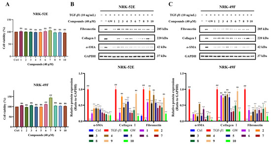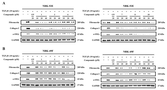 Dose-response relationship of compounds 1, 3, 6–8, and 10 in NRK-52E and NRK-49F cells. (A,B) Representative Western blot bands showing the effects of the compounds on the expression of α-SMA, fibronectin, and collagen I at different concentrations in NRK-52E and NRK-49F (n = 3). GW was used as the positive control.