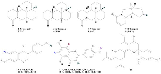 - Wang, H.Q.; Xia, C.B.; Chen, L.; Zhao, J.J.; Tao, W.W.; Zhang, X.; Wang, J.H.; Gao, X.J.; Yong, J.J.; Duan, J.A. Phytochemical Information and Biological Activities of Quinolizidine Alkaloids in Sophora: A Comprehensive Review. Curr. Drug Targets 2019, 20, 1572–1586. [Google Scholar] [CrossRef]