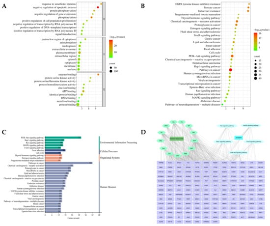 GO analysis of SACG genes for breast cancer multidrug-resistant genes identified 623 biological processes, 110 cellular components, and 180 molecular functions, ranked by corrected p-values. With respect to molecular function, protein binding, ATP binding, metal ion binding, and enzyme binding were identified as the predominant activities. The cellular composition analysis indicated that SACG primarily exerted its effects at the levels of the plasma membrane, cytoplasm, and nucleoplasm. It has been posited that SACG exerts its primary effects on the plasma membrane, cytoplasm, nucleoplasm, and other sites. The mechanism of action of this agent involves binding to proteins, ATP, metal ions, enzymes, and other substances. This binding facilitates the reversal of the resistance of breast cancer cells to adriamycin through the regulation of apoptosis, transcription, protein phosphorylation, gene expression, and other processes (Figure 3A).