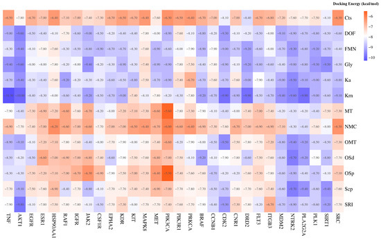 SACG’s molecular docking scores were more negative than −5.5 kcal/mol, and many compounds reached −9, indicating good binding affinity for breast cancer multidrug resistance-related targets. Among the compounds, Krn had the strongest binding ability to multiple targets, such as TNF −10.3 kcal/mol, AKT1 −10 kcal/mol, CDK2 −9.9 kcal/mol, DRD2 −9.9 kcal/mol, PLA2G2A −9.9 kcal/mol, and so on, through multiple hydrogen bonding connections and other binding modes.