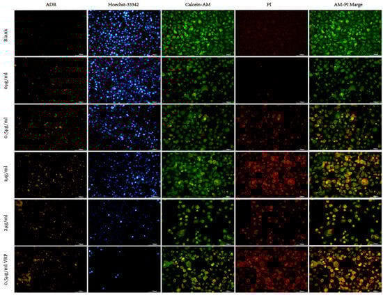 In this study, a blank control group (no addition) and an experimental group (both containing 20 μM ADR) were established. The experimental group was supplemented with 0, 0.5, 1, and 2 μg/mL of Sophora alopecuroides L. active fraction (SaL-30). The changes in the cellular status were observed by ADR autofluorescence and Hoechst-33342 staining, respectively.