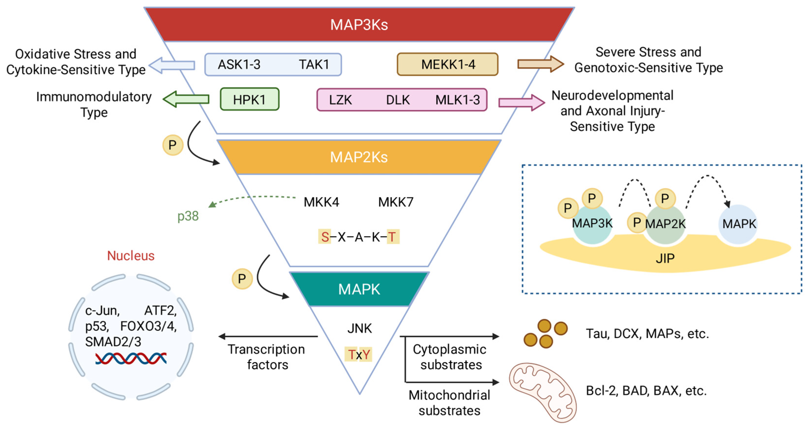 | MLKs | TNF-α, IL-1, UV, heat shock, osmotic pressure, GPCR signals | Involved in cytoskeletal rearrangement, activated by small GTPases (such as Rac1, Cdc42). |