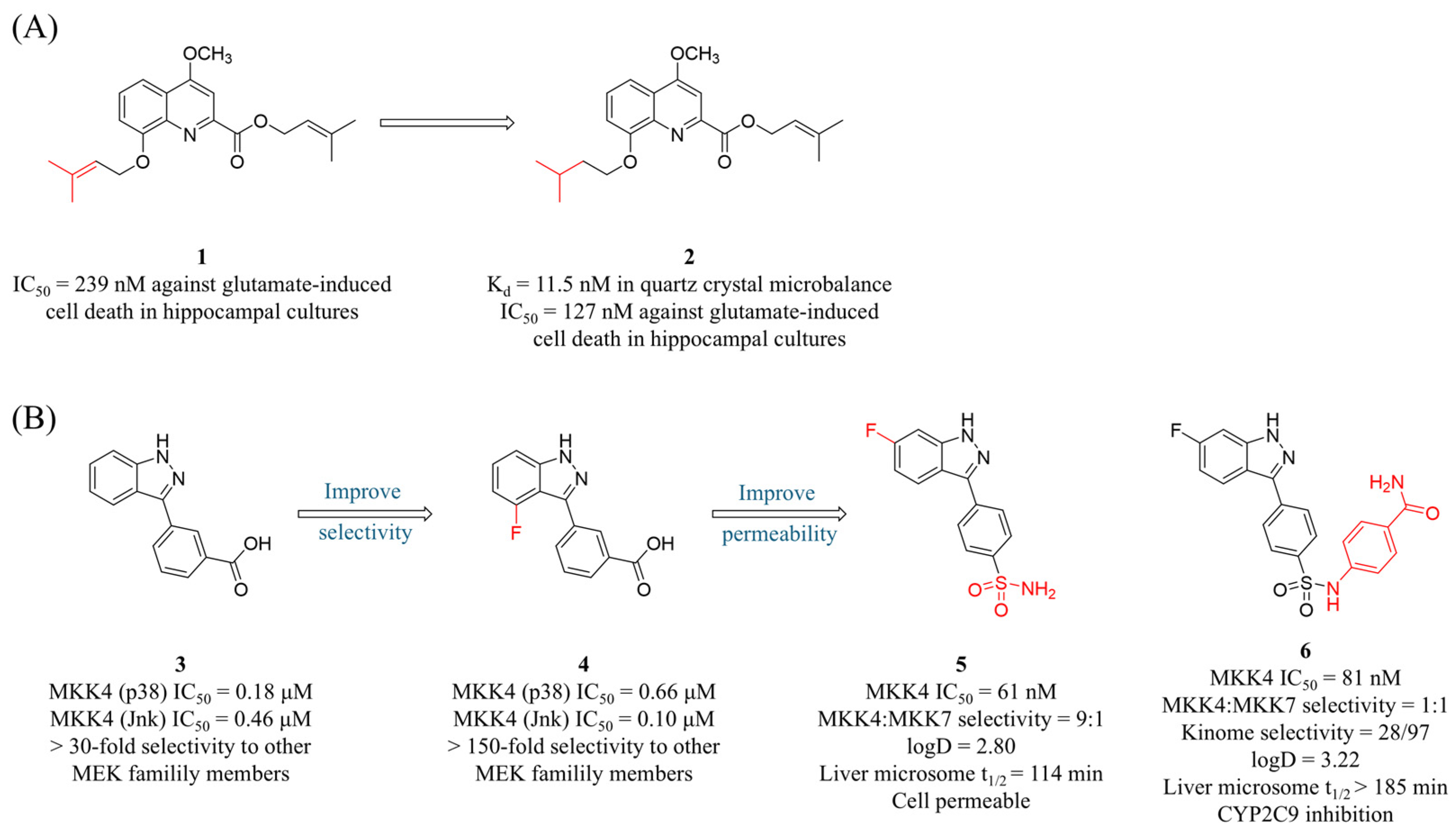 | MKK4 | Compound 2 | Prenylated quinolinecarboxylic acid (PQA) | ATP-competitive (Reversible) | BBB penetrant; Neuroprotection in AD/PD models. | [71] |