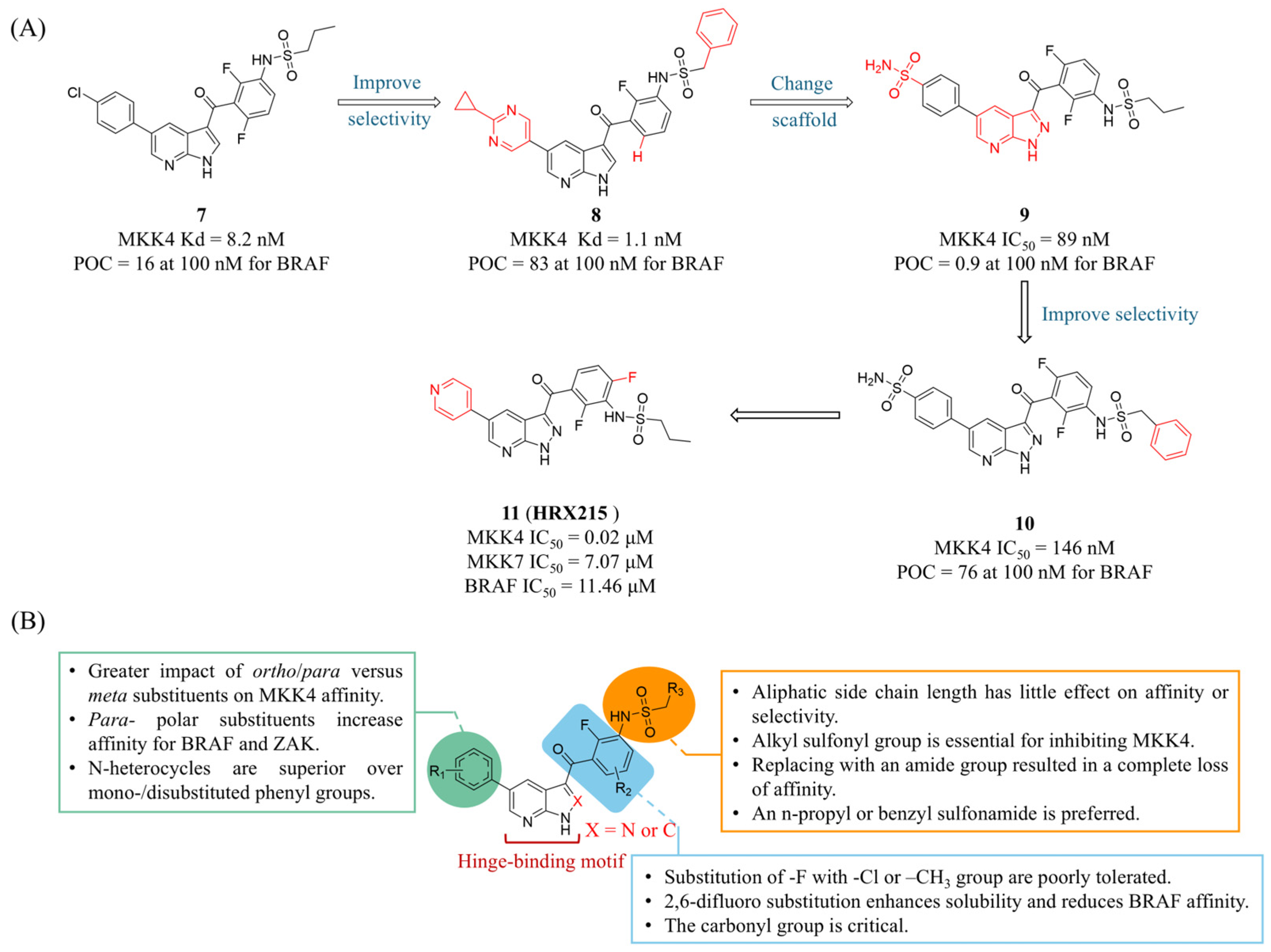 | HRX215 (11) | 1H-pyrazolo[3,4-b]pyridine | ATP-competitive (Reversible) | First-in-class clinical candidate; High selectivity against BRAF; Promotes liver regeneration. | [21] | |