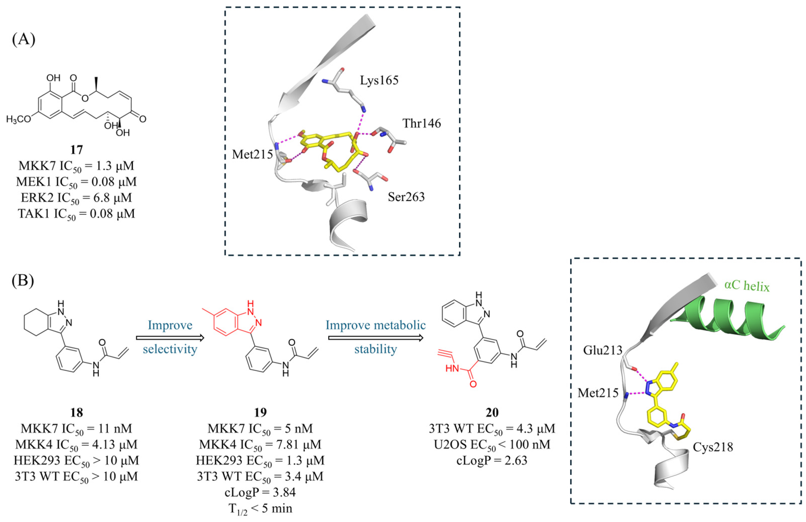| MKK7 | 5Z-7-Oxozeaenol (17) | Resorcinol lactone (Natural Product) | Covalent (Targeting Cys218) | First covalent MKK7 inhibitor; Moderate selectivity. | [63] |