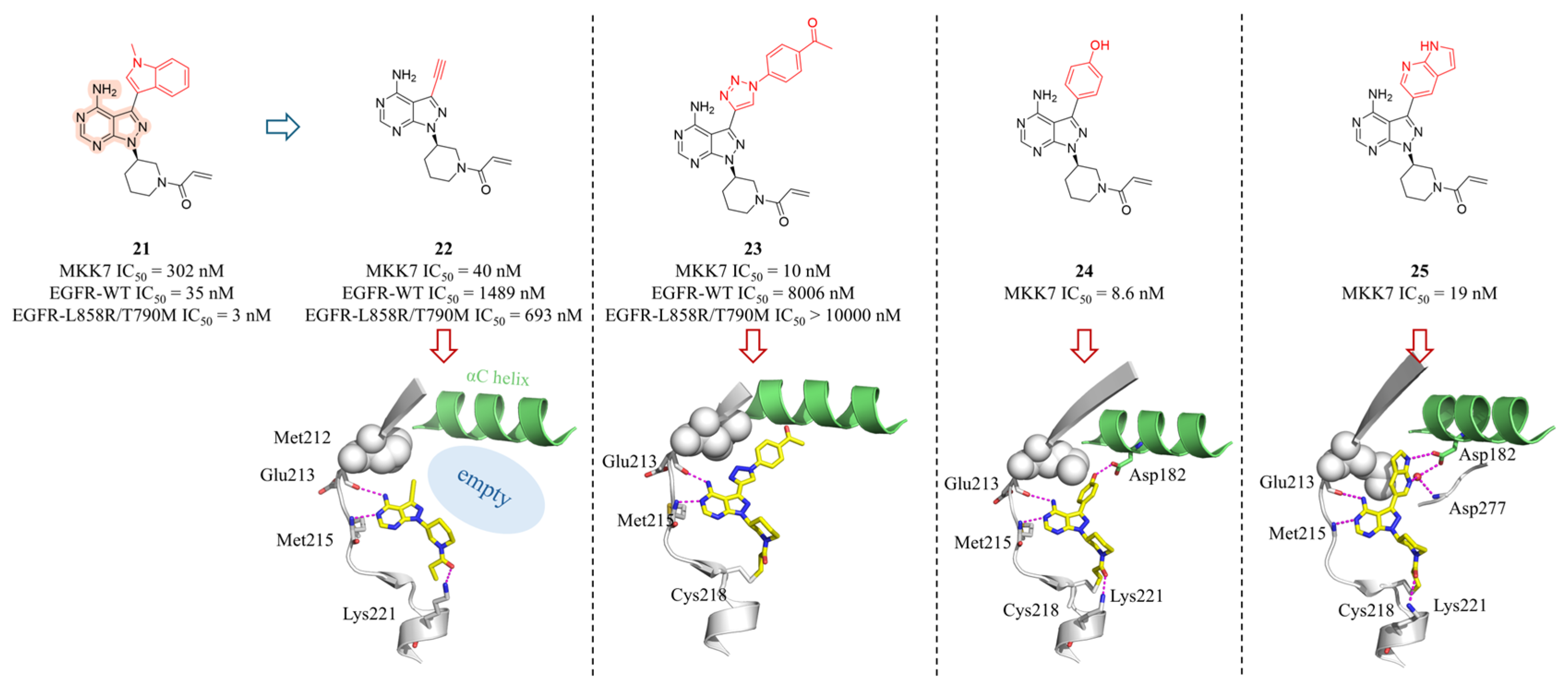 | Compound 23 | Pyrazolopyrimidine | Covalent (Targeting Cys218) | Derived from EGFR inhibitors; Optimized via click chemistry; High LLE. | [67] | |