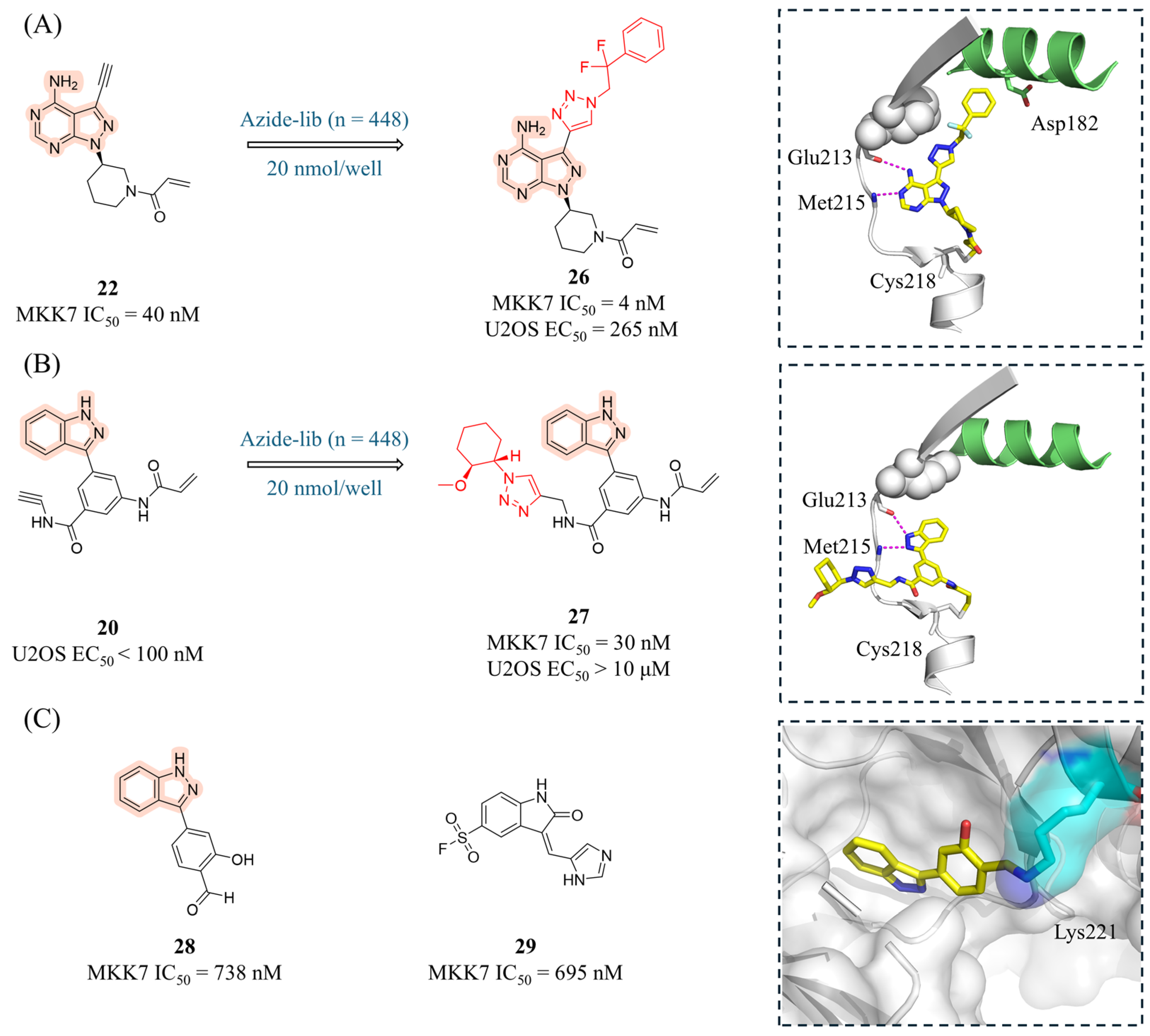 - Gehrtz, P.; Marom, S.; Buhrmann, M.; Hardick, J.; Kleinbolting, S.; Shraga, A.; Dubiella, C.; Gabizon, R.; Wiese, J.N.; Muller, M.P.; et al. Optimization of Covalent MKK7 Inhibitors via Crude Nanomole-Scale Libraries. J. Med. Chem. 2022, 65, 10341–10356. [Google Scholar] [CrossRef] [PubMed]