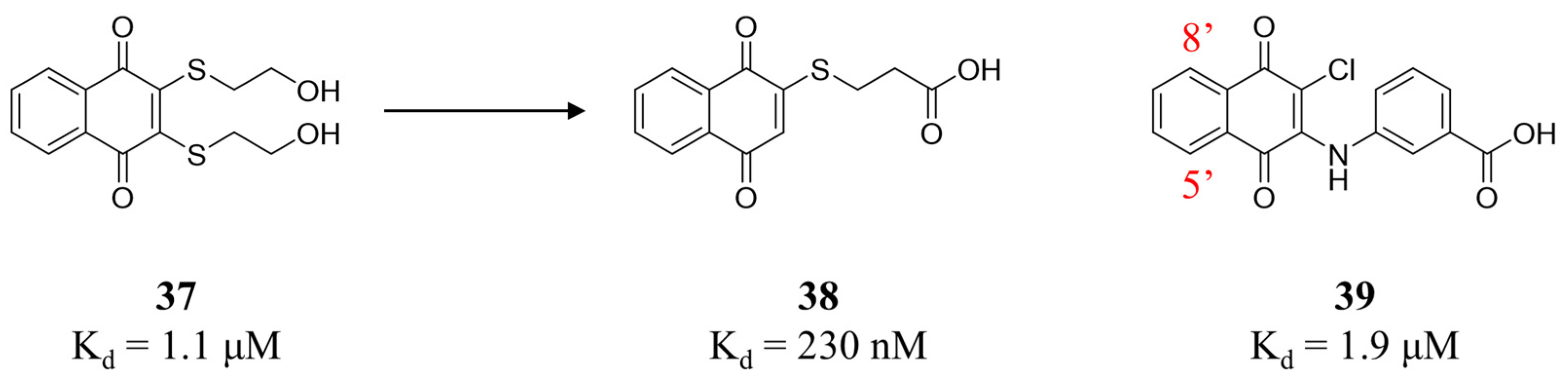 - Schepetkin, I.A.; Karpenko, A.S.; Khlebnikov, A.I.; Shibinska, M.O.; Levandovskiy, I.A.; Kirpotina, L.N.; Danilenko, N.V.; Quinn, M.T. Synthesis, anticancer activity, and molecular modeling of 1,4-naphthoquinones that inhibit MKK7 and Cdc25. Eur. J. Med. Chem. 2019, 183, 111719. [Google Scholar] [CrossRef]