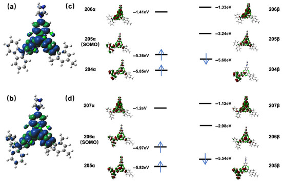 Spin density distribution of (a) TTM-Mes-Cz-Mz and (b) TTM-Mes-Dpa-Mz; frontier molecular orbitals obtained from density functional theory (DFT) calculations: (c) TTM-Mes-Cz-Mz and (d) TTM-Mes-Dpa-Mz. The arrow represents the electron occupying the orbital.