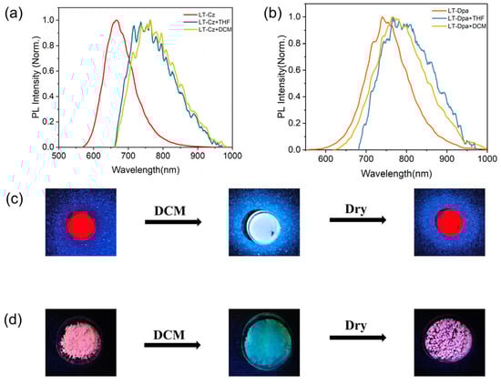 Solid-state emission spectra of (a) LT-Cz and (b) LT-Dpa upon drop-casting DCM and THF; photographs of (c) LT-Cz and (d) LT-Dpa powder under 365 nm UV lamp illumination, showing initial state, after dropping DCM, and after drying.