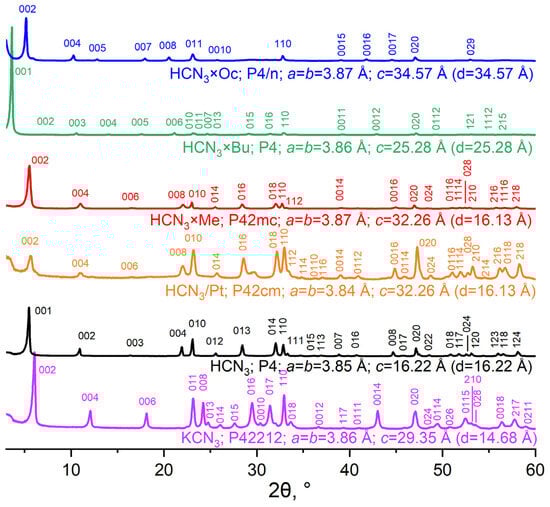 The samples obtained in a reversed order, i.e., with platinisation preceding intercalation, were found to contain multiple phases. This is proven by the doubling of the peaks at those angles where only a single peak is observed for HCN3/Pt. Nevertheless, the sample with methylamine HCN3/Pt×Me turned out to be monophasic and had an XRD pattern close to that of HCN3×Me.