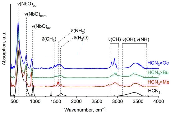IR spectra of HCN3 and the products of amines intercalated into it (HCN3×R).