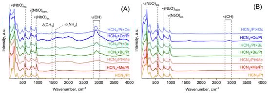 Raman spectra were obtained using a Bruker Senterra spectrometer (Billerica, MA, USA) (wavenumber range 100–4000 cm−1, incident laser 532 nm). For the samples before aqua regia treatment, 5 mW power was used with an accumulation time equal to 30 s; for samples HCN3×Oc/Pt, HCN3/Pt×Bu, 2 mW power was used. For all samples after aqua regia treatment, a 2 mW source was used, whereas accumulation time varied: 80 s for Nb2O5/Pt, 100 s for HCN3/Pt, 140 s for HCN3/Pt×Me, 150 s for HCN3/Pt×Bu, 300 s for HCN3/Pt×Oc, and 200 s for HCN3×Me/Pt, HCN3×Bu/Pt, HCN3×Oc/Pt.