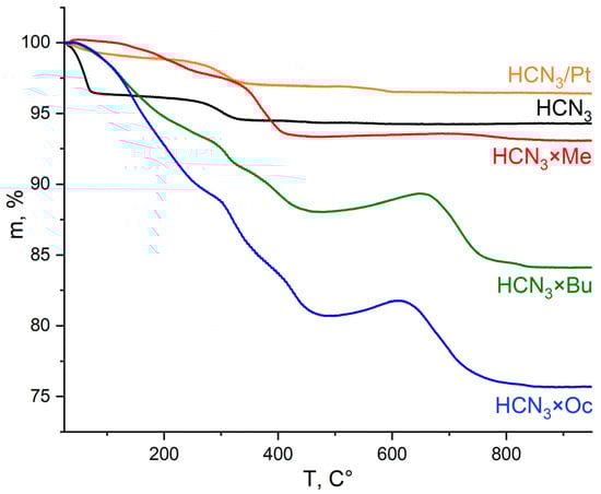 TG curves of HCN3, its platinised form and products of amines’ intercalation (HCN3×R).