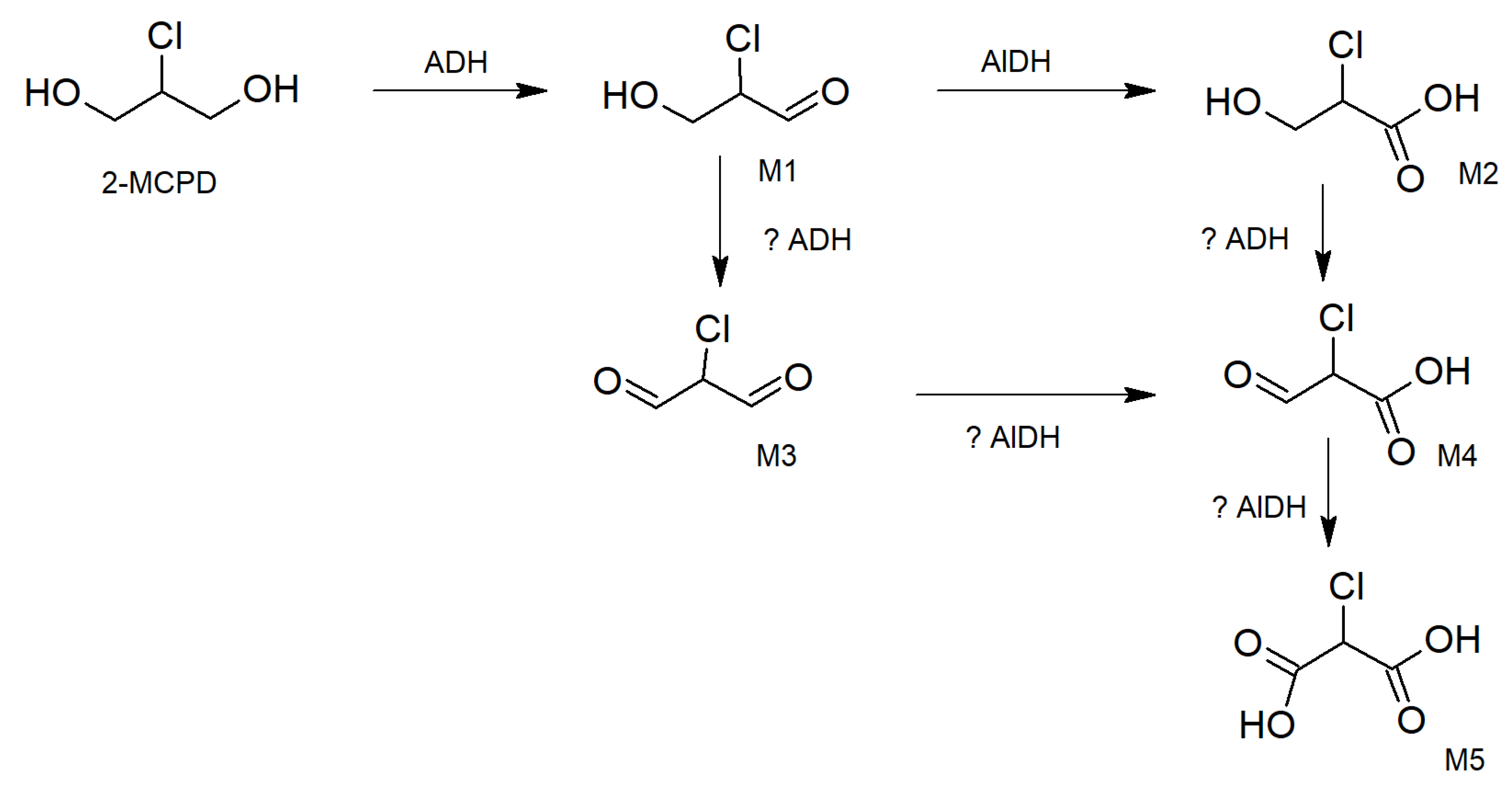- Bergau, N.; Zhao, Z.Y.; Abraham, K.; Monien, B.H. Metabolites of 2-and 3-Monochloropropanediol (2-and 3-MCPD) in Humans: Urinary Excretion of 2-Chlorohydracrylic Acid and 3-Chlorolactic Acid after Controlled Exposure to a Single High Dose of Fatty Acid Esters of 2-and 3-MCPD. Mol. Nutr. Food Res. 2021, 65, 2000736. [Google Scholar] [CrossRef]