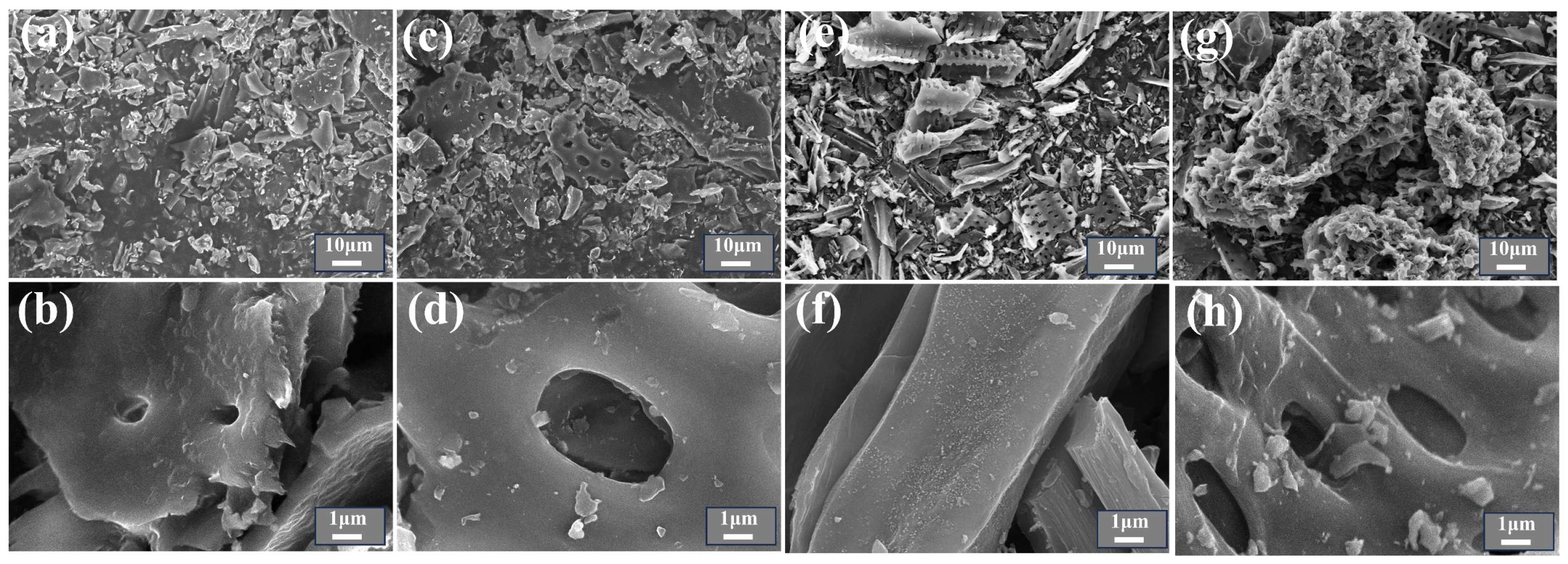 Figure 1a–h, TBC exhibits a well-defined, orderly structure with discernible regular pore arrangements. In contrast, CTAB@TBC displays a looser and more porous morphology, characterized by increased structural complexity and irregular pore distribution. CTAB modification significantly enhances the biochar’s surface roughness, transforming the originally smooth surface into one covered with numerous fine granular particles. This observation confirms that CTAB has been effectively loaded onto the biochar surface [