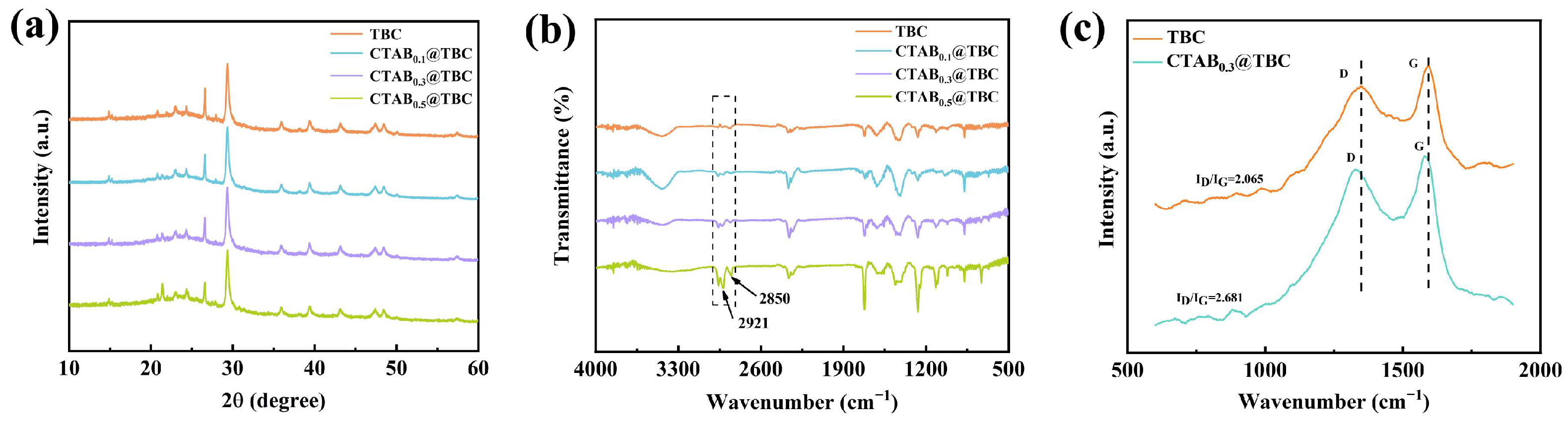 0.3@TBC were 2.065 and 2.681, respectively, demonstrating increased structural disorder in CTAB