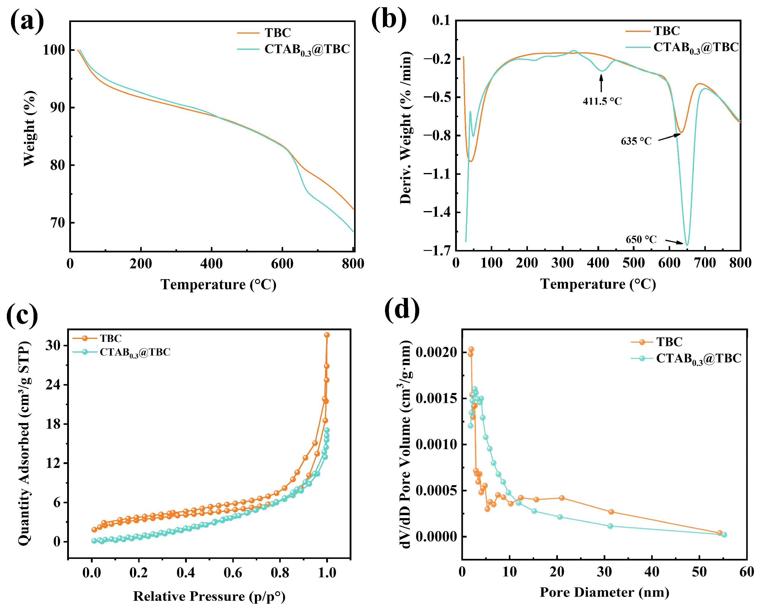 0.3@TBC and TBC are similar. Below 100 °C, a mass loss of 4.98% occurs due to the volatilization of physically adsorbed water. Between 100 °C and 650 °C, the mass loss is 16.74%, primarily caused by the thermal decomposition of CTAB and organic substances such as cellulose and lignin remaining in the biochar. Above 650 °C, a mass loss of approximately 9.80% suggests the gradual decomposition and structural reorganization of the highly stable aromatic carbon framework. Additionally, A characteristic peak at 411.5 °C in the DTG profile of CTAB