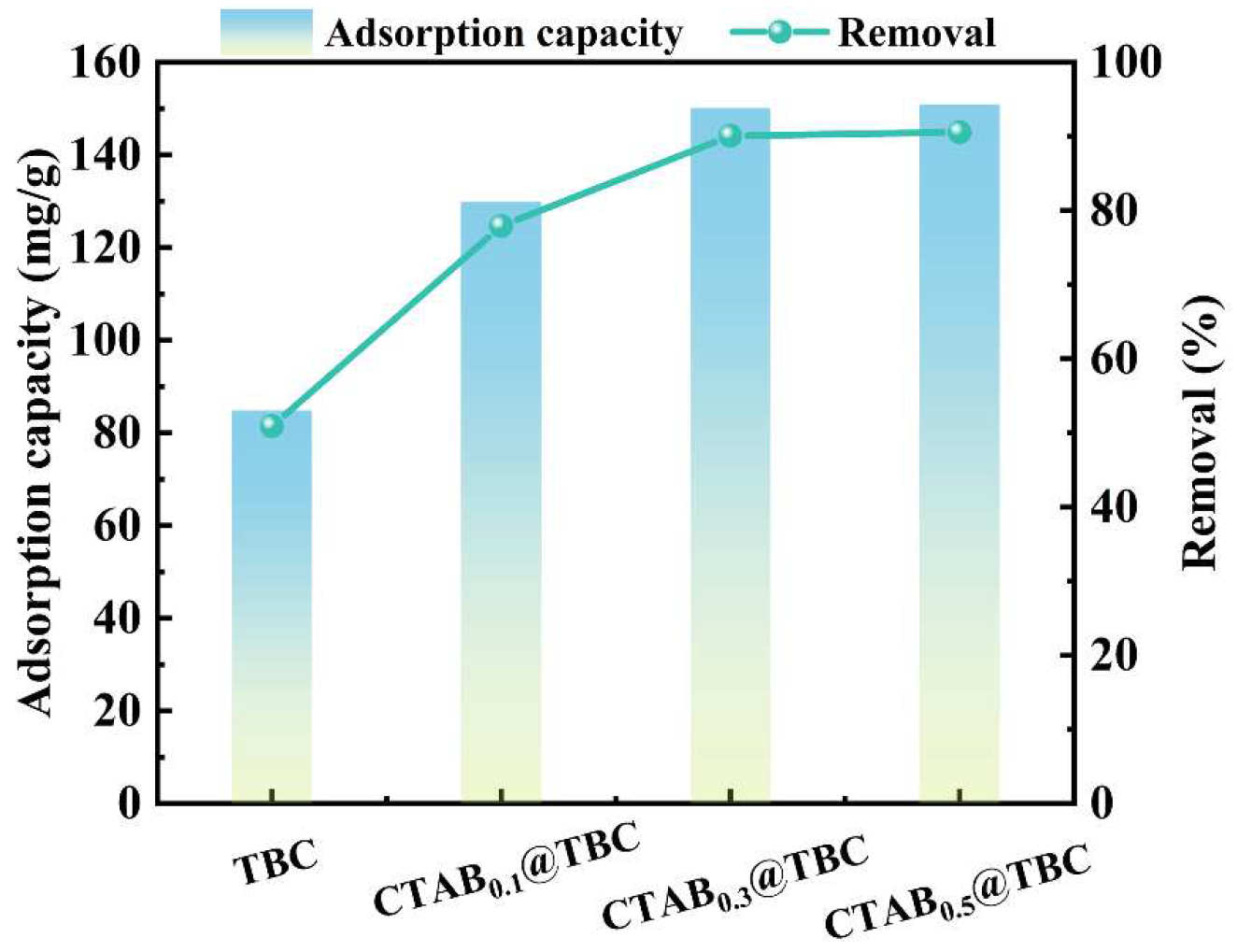 Figure 4. Pristine TBC exhibited a removal efficiency of 50.9% and an adsorption capacity of 84.83 mg/g. As the CTAB content increased, both the removal efficiency and adsorption capacity of CTAB@TBC were enhanced. Specifically, the removal efficiency increased from 77.90% for CTAB