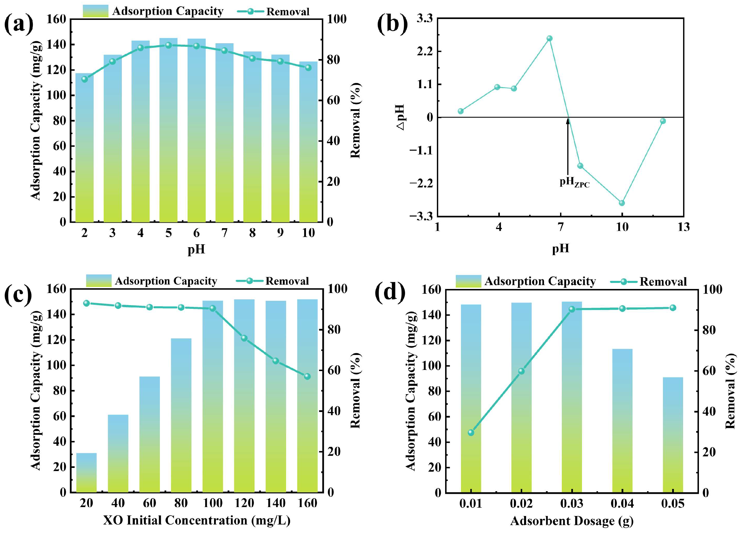 Figure 5a). Adsorption capacity and removal efficiency exhibited clear pH dependence: both increased across pH 2.0–5.0 and then declined progressively over the range 5.0–10.0. This phenomenon arises from the combined influence of the surface charge of CTAB@TBC and the pH-dependent dissociation behavior of XO. As the pH changes in aqueous solution, XO transitions among various ionic species (e.g., H
