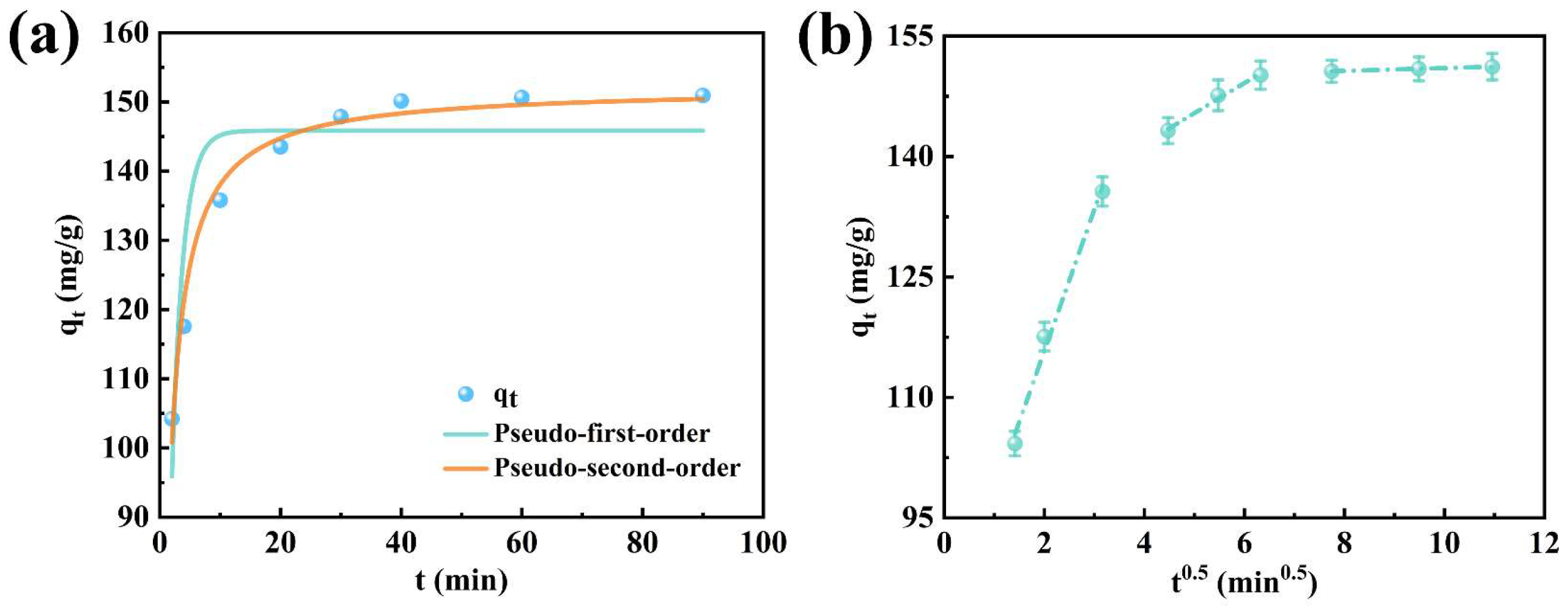 Figure 7, the pseudo-first-order kinetic, pseudo-second-order kinetic, and intra-particle diffusion models were used to analyze the kinetic behavior of the adsorption process. The rate constants k