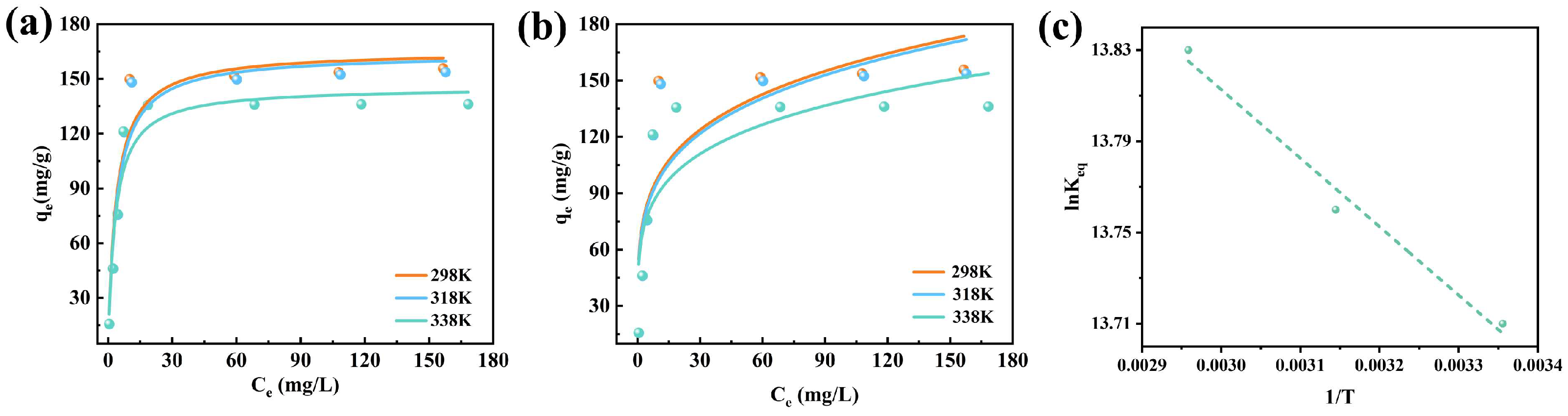 Figure 8c, demonstrates that the adsorption behavior follows the Van’t Hoff model. Based on the fitted line, the ΔH and ΔS were derived from its slope and intercept. A complete set of thermodynamic parameters is provided in