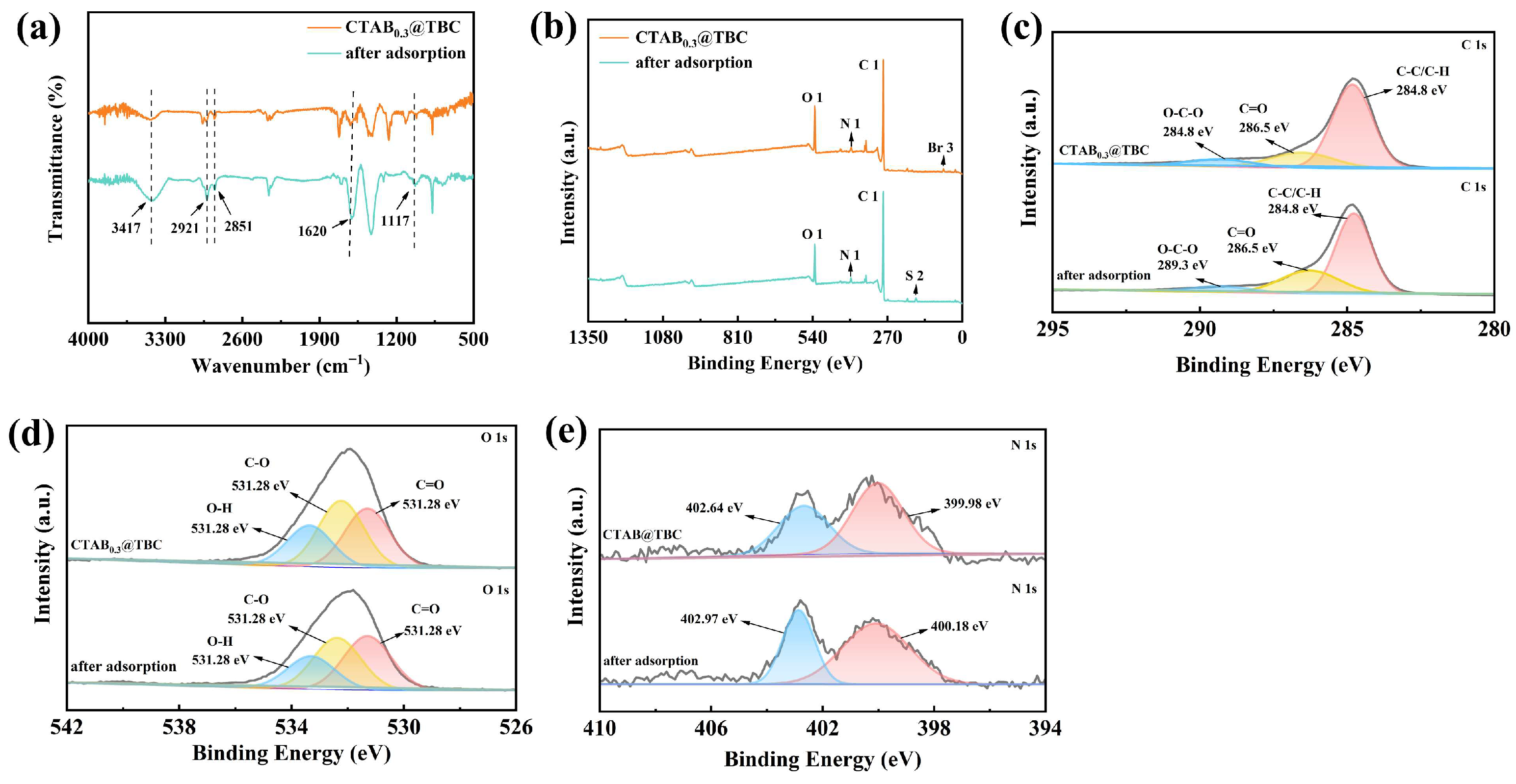 − in CTAB) confirm an ion exchange process, which is a form of electrostatic attraction. This ion exchange represents a dominant chemical interaction in the intermediate stage of adsorption. The C 1s spectrum exhibited no significant changes, indicating that the carbon backbone did not participate in the adsorption process, which supports that the main interactions occur at the functional groups rather than the carbon skeleton [