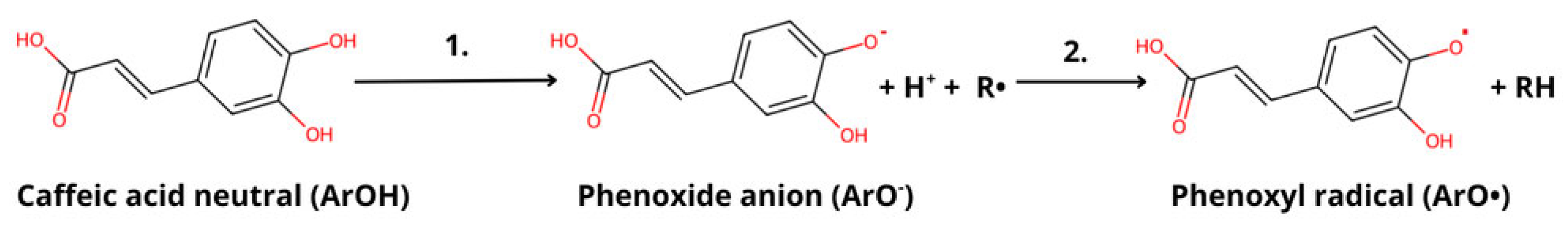 - Mazzone, G. On the Inhibition of Hydroxyl Radical Formation by Hydroxycinnamic Acids: The Case of Caffeic Acid as a Promising Chelating Ligand of a Ferrous Ion. J. Phys. Chem. A 2019, 123, 9560–9566. [Google Scholar] [CrossRef] [PubMed]