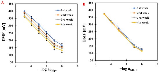 After several days of conditioning the electrodes, measurements were started. The first stage was to determine the ISEs’ response curves. The curves were obtained by plotting the relationship between the electromotive force and the negative logarithm of the main ion (NH4+) activity. The measurements were carried out over a concentration range of 1 × 10−7 to 1 × 10−1 M by adding appropriate volumes of NH4Cl solutions at concentrations of 1, 0.1, 0.01, and 0.001 M. Based on the determined calibration curves (Figure 1), the electrodes were characterized by determining the basic parameters: slope, detection limit, and linearity range. The measurements were carried out over four weeks for all modified electrodes and compared with a classic, unmodified ammonium electrode—the results are presented in Table 1. The modified electrodes showed increased sensitivity compared to GCE/NH4-ISM. It is worth mentioning that in the first week of testing, the electrode modified with nanocomposite achieved a value close to the theoretical slope (58.4 mV·dec−1), and the sensitivity remained stable throughout the analysis. The results obtained with our electrodes outperformed those reported for other NH4+-ISEs in the literature, which showed slopes of 57.3 mV·dec−1 [28], 54 mV·dec−1 [29], and 49.6 mV·dec−1, while their linearity ranges were comparable to those of our sensors [30]. No significant changes were observed in the linearity range (it remained stable during measurements and was 10−1–10−5 M) and the detection limit (in the micromolar range). The best-performing electrode developed in this work exhibited a lower limit of detection (LOD) of 2.5–3.9 × 10−6 M, which is superior to that reported for the NH4+-ISE described in the literature. In the latter case, accurate determination of NH4+ ions was not possible at concentrations below its LOD, which is higher than 5.5 × 10−6 M [31]. However, in the study reported in [32], a sensor selective to ammonium was demonstrated to exhibit a slightly wider linear range and a marginally lower limit of detection compared to the electrode presented in our work. An extremely impressive improvement was noted in long-term stability, determined as the standard deviation of the E0 value over four weeks. The lowest SD was obtained for GCE/CNC/NH4-ISM, which was 3.3 mV, indicating that the presence of the composite material significantly improved the stability of the electrode.