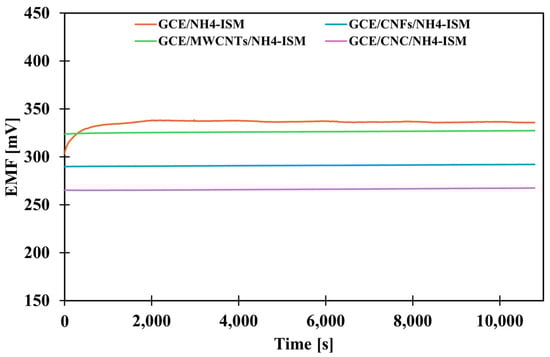 As in the case of potential stability, we also wanted to check the benefit of introducing the proposed intermediate layer, this time by determining the parameter of potential reversibility. Potential reversibility is a fairly important parameter, which was determined by measuring the potential in solutions of different concentrations alternately. The measurements were carried out for about 5 min in each NH4Cl solution—first, the measurements were alternated in solutions with concentrations of 10−4 and 10−3 and then in solutions of 10−3 and 10−2 M. A graphical illustration of the determined dependence of potential on time under given concentration conditions is shown in Figure 3. Based on the achieved results, deviations from the average potential values at a given concentration were calculated (Table 3). Based on the obtained data, we can conclude that the smallest deviations were recorded for high concentrations, which is a logical conclusion: the more diluted the solution, the greater the deviations from the mean value. CNFs- and MWCNTs-modified electrodes exhibit very similar potential reversibility, several times better than that of the GCE/NH4-ISM electrode. However, the use of single-media transducers is not as effective as the use of a composite (combination of these two elements), because the GCE/CNC/NH4-ISM electrode showed the smallest deviations from the average values for a given concentration (SD order for decreasing concentrations): 0.11, 0.18, 1.61 mV. This indicates that the best modification option is to use composites of multi-walled carbon nanotubes and carbon nanofibers. The reversibility results are consistent with the stability of the individual electrodes’ potentials, and their responses at specific concentrations correspond well with the potential values obtained from the calibration curves.
