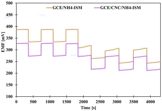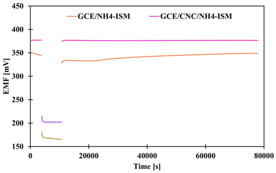 The classic way to determine whether a water layer forms between individual electrode elements, i.e., at the interface between the membrane and the intermediate layer, the membrane and the internal electrode, or the intermediate layer and the internal electrode, which negatively affects the results—their repeatability and reliability—is to perform an appropriate test. This procedure was proposed by Pretsch and co-workers [34]. This involves measuring the potential first in a 0.1 M solution of the main ion (1 h) (NH4Cl), then in a 0.1 M solution of the interferent (NaCl) (3 h), and then again in the same solution of the main ion (21 h). When we observe a potential drift after replacing the interfering solution with the main ion, it means that the electrode is unstable and there is a high risk that a water layer has formed between some of the ISE layers. Figure 6 shows a graphical illustration of the results for the control electrode and the electrode modified with carbon nanocomposite. As we can see, the ammonium electrode with a solid contact layer in the form of CNC showed a stable potential after changing the solutions, which proves that it is more resistant to the formation of a water layer than the modified electrode, as such a drift occurred for the GCE/NH4-ISM electrode.