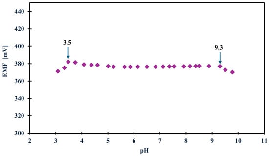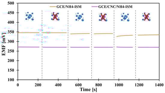 In the case of planning field studies or other studies not conducted in laboratory conditions, it is crucial to determine how various external conditions, such as changes in illumination, various sample pH or the influence of sample saturation with different gases, i.e., oxygen, carbon dioxide, and nitrogen, affect the potential (whether it is stable, drifts toward positive or negative values, or perhaps the values shift totally depending on the conditions). Therefore, to determine how the above-mentioned factors affected the tested NH4+ electrodes, we first carried out measurements in variable lighting conditions. The measurements were carried out alternately in full daylight and in the absence of sunlight in NH4Cl samples with a concentration of 1 × 10−3 M. None of the tested modified electrodes showed sensitivity to this factor. Only the unmodified electrode showed a potential drift towards higher potential values, which is probably due to the lack of material exhibiting ion-to-electron conductivity rather than sensitivity to light. In turn, the optimal pH range in which the electrode maintained linearity was determined in a 1 × 10−3 M KNO3 solution, to which additions of nitric acid (V) or sodium hydroxide were made to change the pH of the solution. Based on the data, a curve was plotted showing the dependence of the potential on the pH of the sample—Figure 4 shows the results for the GCE/CNC/ISM electrode. The electrode showed a stable potential between 3.5 and 9.3 pH. The effect of the presence of various gases in the test sample on the electrode potential was also investigated. For this purpose, the potential was measured for several minutes in a 1 × 10−3 M NH4Cl solution, and there were two sample variants. The first was a classic sample at room temperature saturated by oxygen (O2) and carbon dioxide (CO2) from the air, while the second sample was deoxygenated by passing a stream of nitrogen (N2) through it. The measurements were carried out alternately, and the comparative effects of the obtained results for the unmodified electrode and the one with a carbon composite intermediate layer are presented in Figure 5. The modified electrodes (both with a single-component and two-component solid contact) showed no sensitivity to the presence of gases. For comparison, the unmodified electrode showed slight deviations from the norm, which again makes CNC modification an excellent solution for ammonium electrodes.