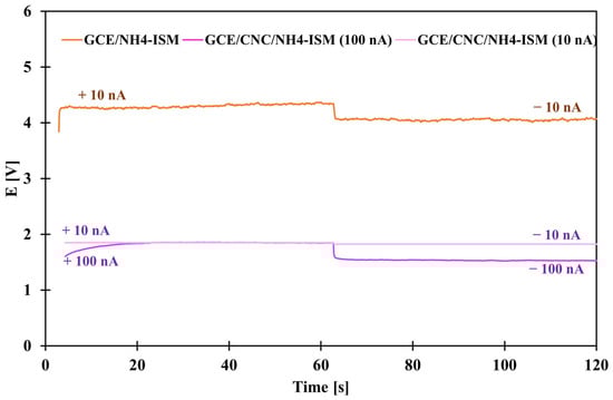 Chronopotentiograms obtained for GCE/NH4-ISM (for 10 nA) and GCE/CNC/NH4-ISM (for 10 and 100 nA).