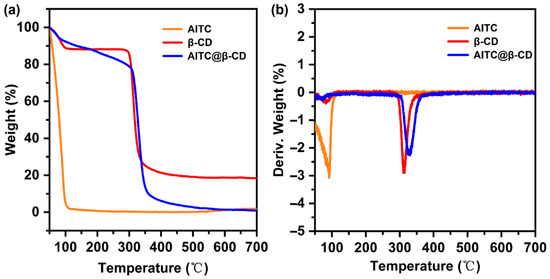 (a) TGA and (b) DTG curves of AITC, β-CD, and AITC@β-CD inclusion complex.