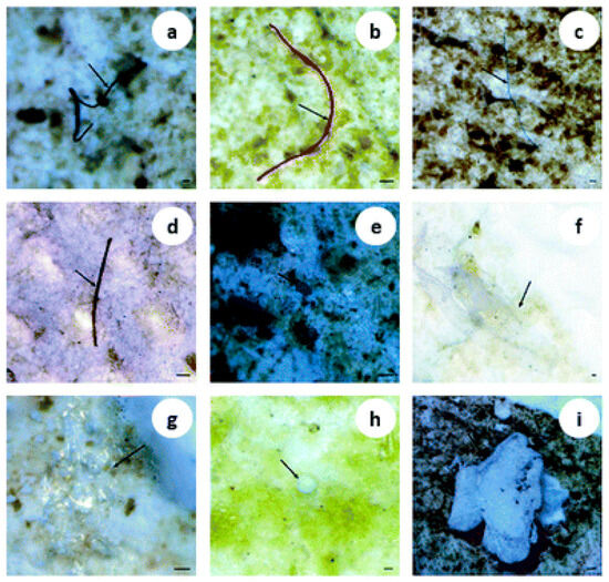 Representative Morphological Types of MPs Identified in Environmental Samples: (a–d) fibers; (e,f) fragments; (g) films; (h,i) granules. The colors represent the natural appearance of the particles and the surrounding environmental matrix under optical microscopy. Scale bar = 100 µm. Reproduced from ref. [28] with permission from the Royal Society of Chemistry.