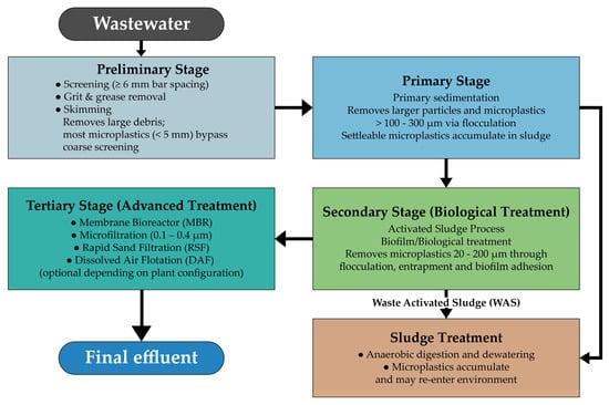Conceptual diagram illustrating MP pathways and removal mechanisms across the treatment stages of a conventional WWTP (Figure 2). Preliminary screening (bar spacing ≥ 6 mm) and grit-removal units primarily capture large debris, thereby allowing most MPs (<5 mm) to bypass these stages [6]. During primary sedimentation, density-driven settling and flocculation promote the removal of larger or more settleable MPs, typically > 100–300 µm [4]. Secondary biological treatment further reduces MP loads through bio-flocculation, entrapment within activated-sludge flocs, and biofilm adhesion, particularly for particles in the 20–200 µm range; however, buoyant or fibrous MPs may persist through this stage [4,6]. Tertiary and advanced treatment technologies—including rapid sand filtration, dissolved air flotation, microfiltration/ultrafiltration (≈0.1–0.4 µm), and membrane bioreactors—provide enhanced physical retention and can achieve removal efficiencies exceeding 97–99% [50]. In addition to effluent discharge pathways, the diagram also depicts the accumulation of MPs in primary and secondary sludge, which serves as a major sink within WWTPs and a significant vector for environmental re-entry during sludge treatment, land application, and disposal [51,52]. These pathways highlight the dual role of WWTPs as barriers and conduits for MP dissemination across aquatic and terrestrial environments.