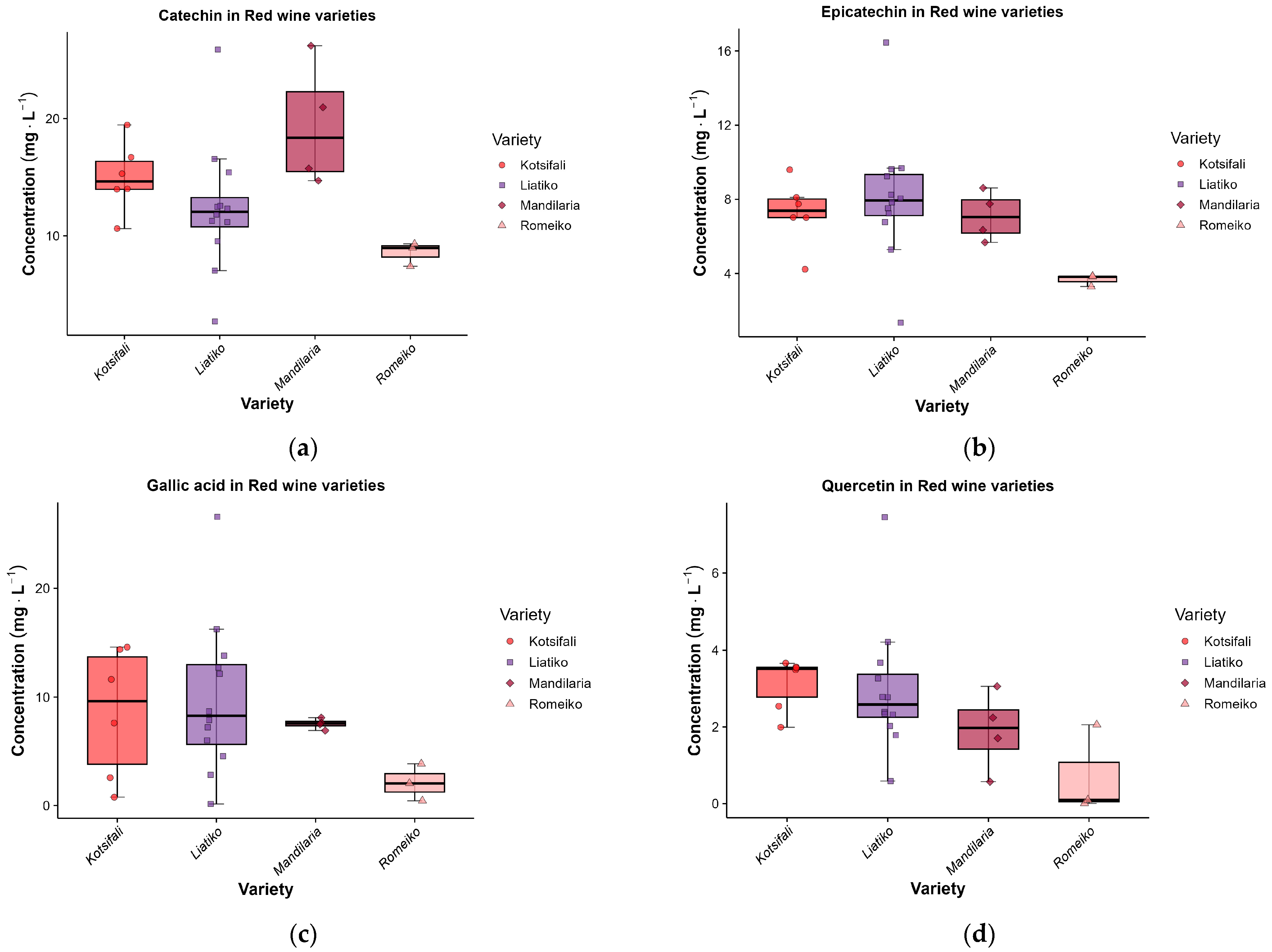 | Flavonoid/Non-Flavonoid | Phenolic Category | Compounds | Kotsifali (n = 6) | Liatiko (n = 12) | Mandilaria (n = 4) | Romeiko (n = 3) | Welch p | η2 |