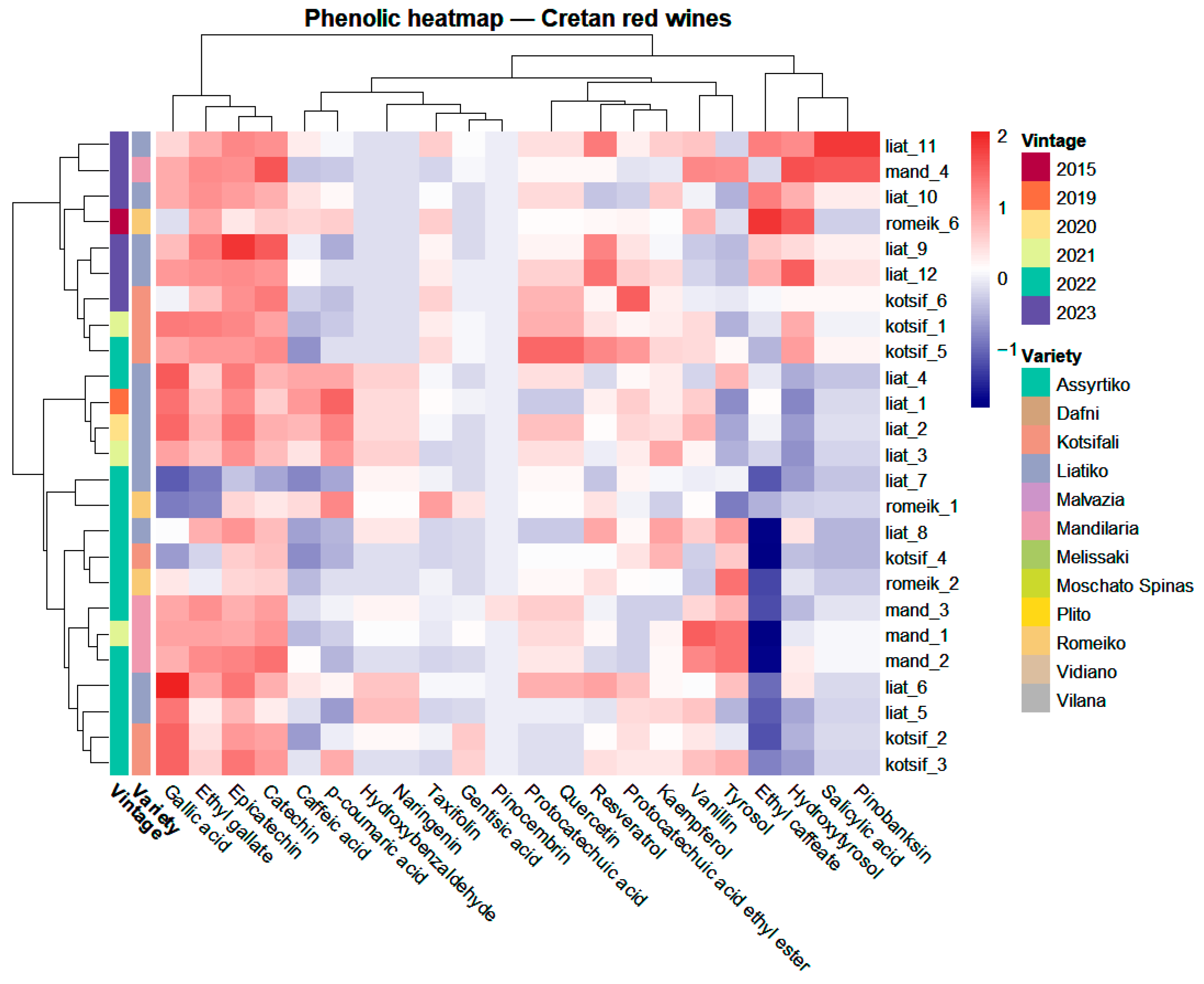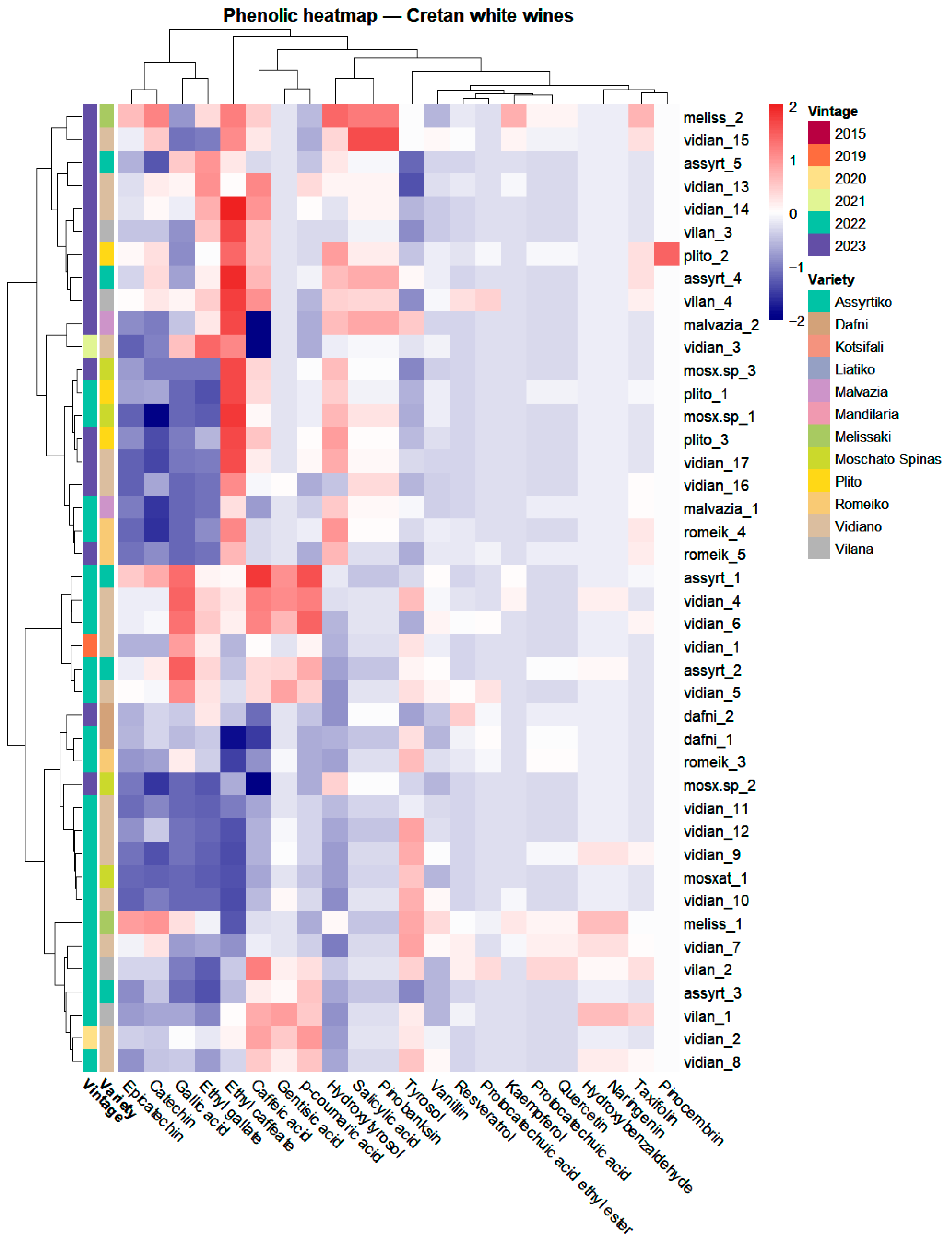APA StyleLekka, P., Dimitropoulou, M., Rousali, A., Kiose, A.-M., Basalekou, M., Thomaidis, N., & Dasenaki, M. (2026). Decoding Cretan Wines: Phenolic Profiling of Greek Indigenous Wine Varieties Using LC-QTOF-MS. Molecules, 31(5), 815. https://doi.org/10.3390/molecules31050815