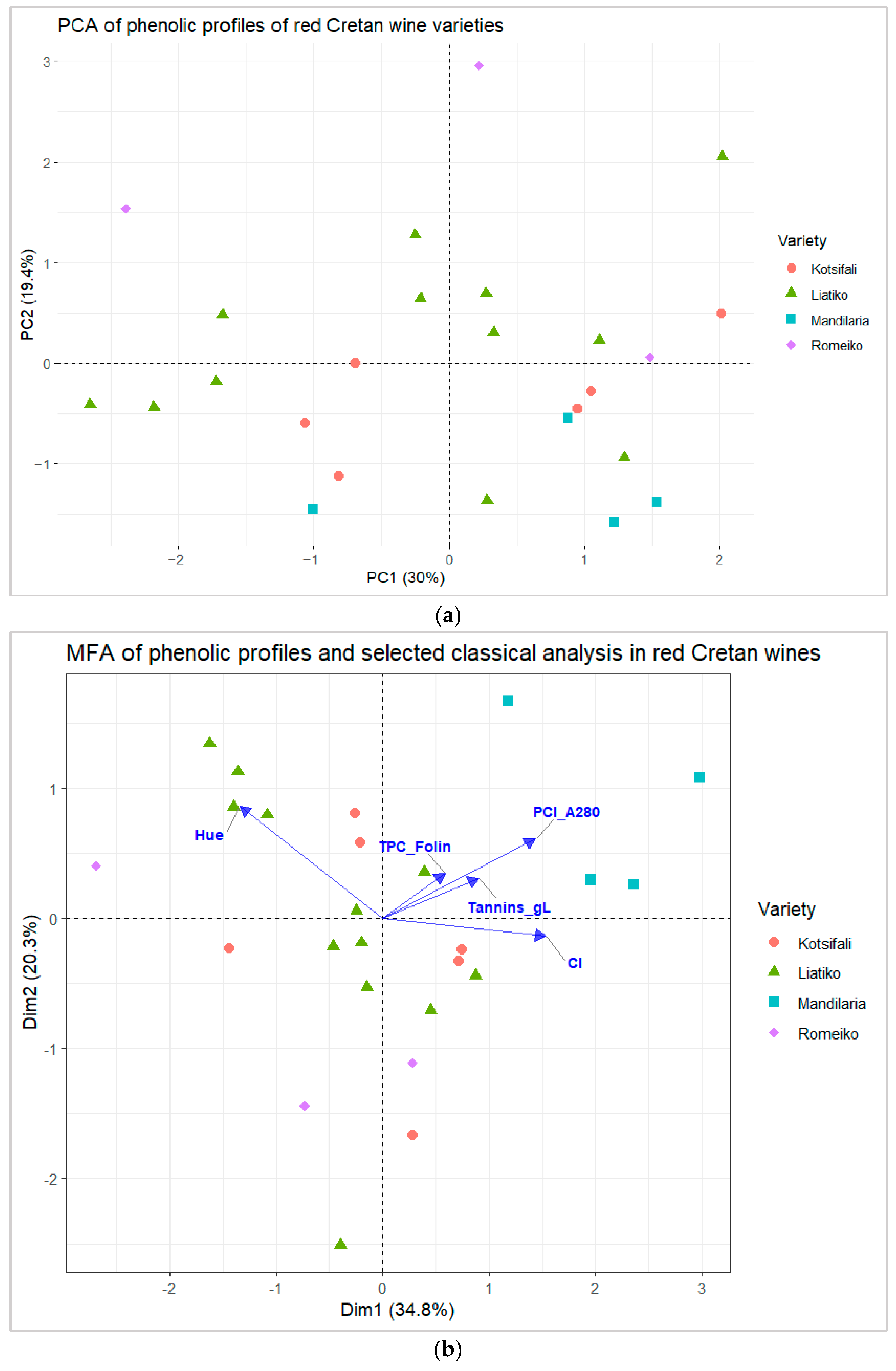 - Kallithraka, S.; Arvanitoyannis, I.S.; Kefalas, P.; El-Zajouli, A.; Soufleros, E.; Psarra, E. Instrumental and Sensory Analysis of Greek Wines; Implementation of Principal Component Analysis (PCA) for Classification According to Geographical Origin. Food Chem. 2001, 73, 501–514. [Google Scholar] [CrossRef]