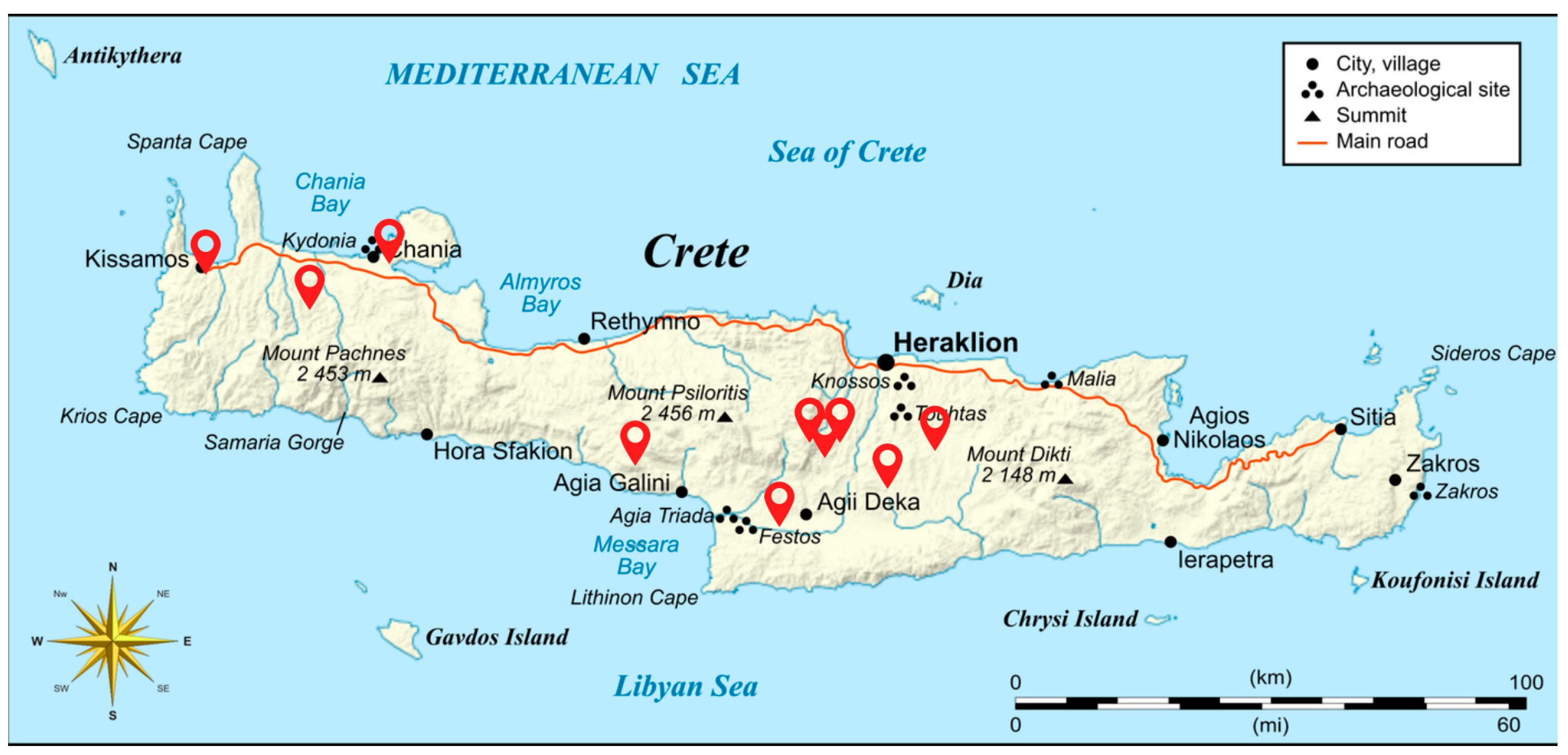 - Gaba, E. English: Integrated Map of Crete Island, Greece, Македoнски: Карта На Крит. Available online: https://commons.wikimedia.org/wiki/File:Crete_integrated_map-mk.svg (accessed on 28 January 2026).