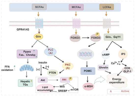 Effects of different fatty acids on peripheral tissue metabolism or function (By Figdraw) The alkyl chain length affects the biological function of fatty acids through multiple mechanisms. Take regulating obesity as an example, SCFAs act on GPR41 and GPR43 to interfere with downstream gene expression, thereby promoting lipid metabolism. MCFAs and LCFAs apply to GPR40 and GPR120, respectively, regulate transcription factor expression and hormone secretion, and control energy metabolism, thus enhancing satiety. Arrows outside the text boxes indicate the subsequent induced reaction, while arrows inside the text boxes represent a trend of change. ↑—up-regulation; ↓—down-regulation. Abbreviations: SCFAs, short-chain fatty acids; MCFAs, medium-chain fatty acids; LCFAs, long-chain fatty acids; Gi/o, guanine nucleotide-binding protein, inhibitory α subunit; PLC, phospholipase C; PKC, protein kinase C, PTEN, phosphatase-tensin gene; SREBP, sterol-regulatory element binding protein; POMC, pro-opiomelanocortin; CCK, cholecystokinin; GLP-1, glucagon-like peptide-1; Ppara, peroxisome proliferator-activated receptor alpha; FFA, free fatty acids; TGs, triglycerides; Akt, ak strain transforming; Fas, fatty acid synthase; Chrebp, carbohydrate response element binding protein; mTOR, mammalian target of rapamycin; FOXO3, forkhead box protein O3; Gq/11, guanine nucleotide-binding protein, q/11 polypeptide; α-MSH, α-melanocyte-stimulating hormone; Ghrelin, growth hormone secretagogue.