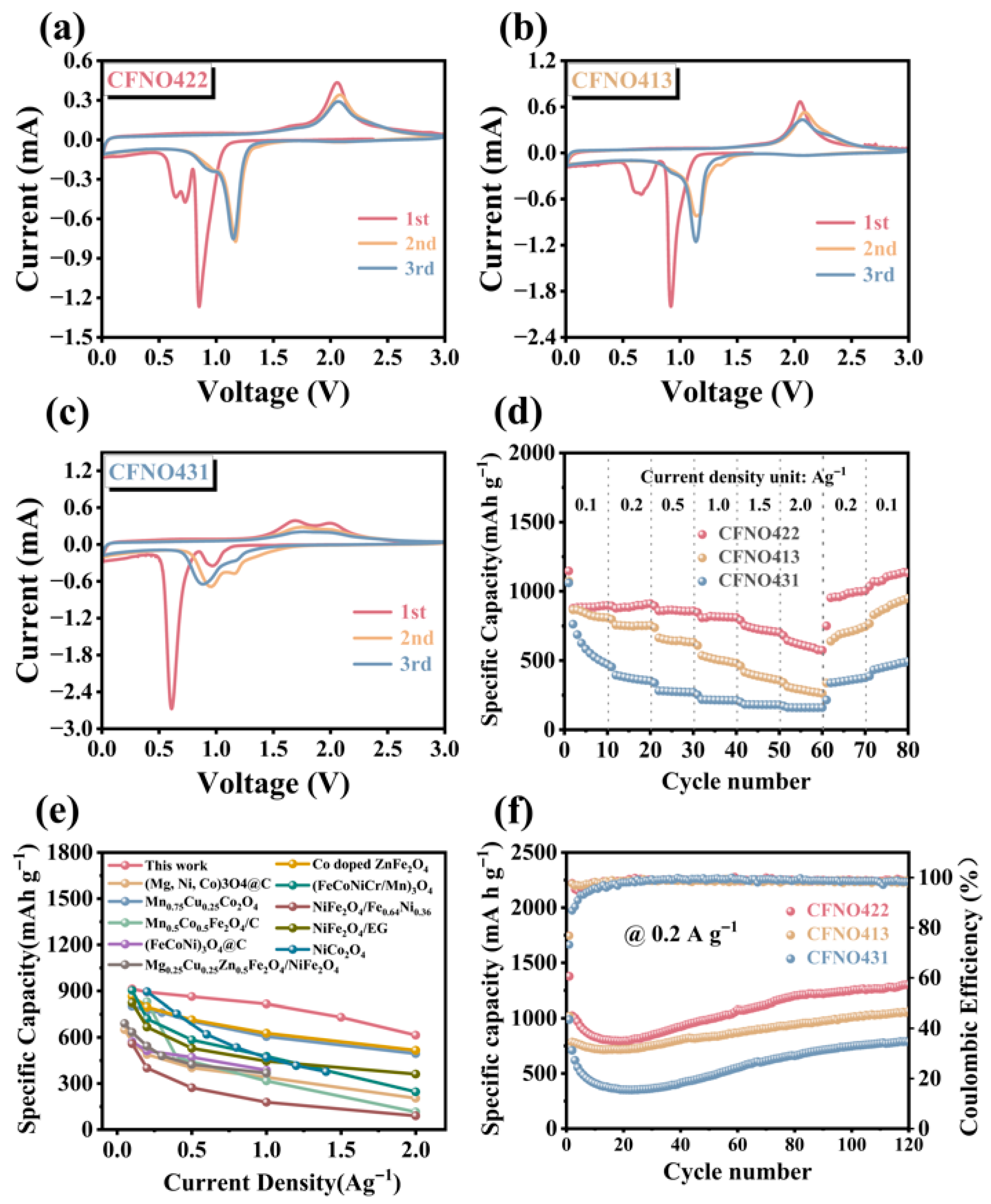 APA StyleHu, D., Yu, N., Hua, W., Gao, X., Luo, Y., Wu, Y., Shu, D., & Zhang, L. (2026). Trimetallic Zeolitic Imidazolate Framework-Derived CoNiO2/NiCo2O4/NiFe2O4 Hierarchical Architecture: Unveiling Multi-Component Synergism for Ultrahigh-Capacity and Highly Stable Lithium Storage. Molecules, 31(5), 855. https://doi.org/10.3390/molecules31050855