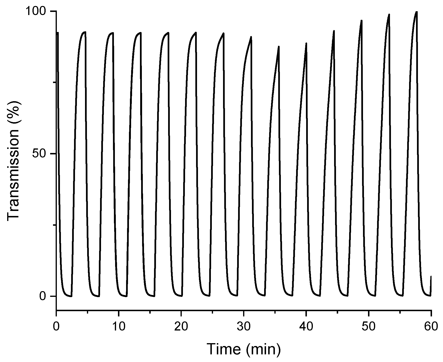 - Guedes, A.F.; Silva de Lima, R.; Tartari, S. Electrochromic Smart Windows with Visible-Light Modulation and Radiation UV Filter. In Proceedings Volume 13453, Window and Dome Technologies and Materials XVIII; SPIE: Bellingham, WA, USA, 2025. [Google Scholar] [CrossRef]
