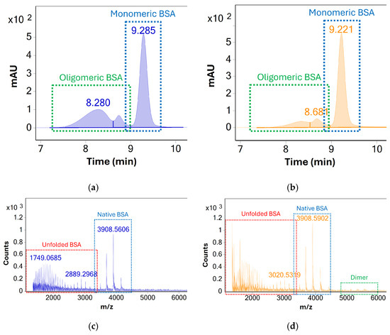 Furthermore, an additional chromatographic peak could be detected using UV, which eluted slightly before the chromatographic peak of oligomeric BSA, indicating the presence of higher molecular weight aggregates. The peak did not produce a detectable MS response, most likely because of their very high neutral mass, which is outside the capabilities of the instrument used. The lack of MS response may also be due to the much wider molecular weight distribution, which in turn produces a much greater number of MS signals at lower intensity compared to the few high-intensity signals of oligomeric and monomeric species.