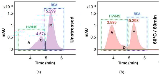 UV (280 nm) chromatograms of BSA (a) before stress testing and (b) after heating at 60 °C for 60 min. A clear increase of higher order aggregates (A, visible at 3.9 min) is observed as the concentration of oligomeric (O, 4.7 min) and monomeric BSA (M, 5.3 min) decreases. Unlike at 70 °C, all three peaks remain separated throughout stress testing at 60 °C. However, peaks A and O are summed and reported as HMWS for preliminary screening for the sake of consistency.