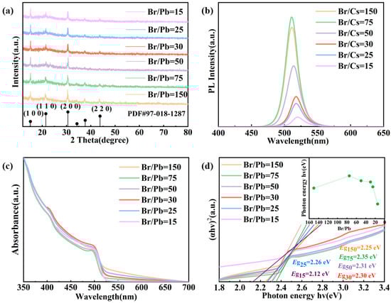 (a) XRD patterns; (b) PL spectra; (c) UV-vis absorption spectra; and (d) corresponding bandgap energies of CsPbBr3 QDs synthesized with different Br/Pb molar ratios.